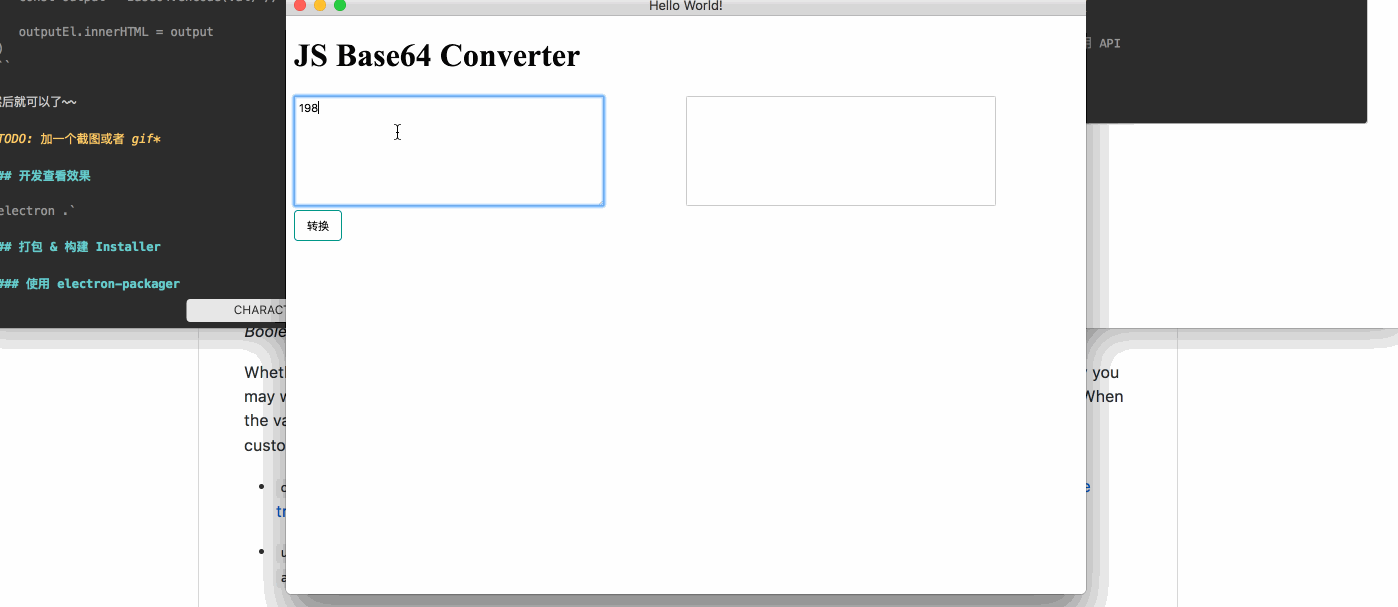 接下来的事情就交给这个 HTML 文件了,你可以根据自己的实际需要随意编写,在 base64-convertor 这个应用中,我需要在前端展示一个 “一键转换” 的功能,所以需要一个输入框和一个输出结果的框,以及一个 “转换” 按钮。